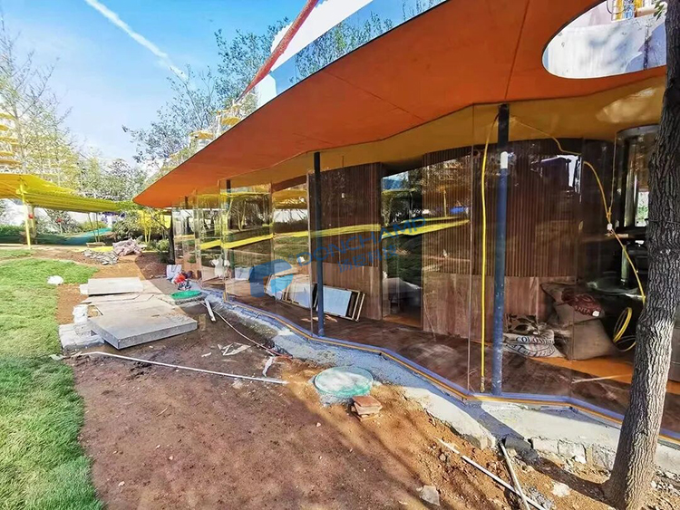 若说抗黄变是内在韧性,加工安装技术便是外在骨架。这座9.2吨重的咖啡厅,由87片异形亚克力板拼接而成,单片最大尺寸:2750*1497mm。