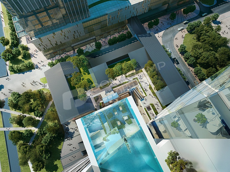 The swimming pool has a total length of 21.6 meters, a width of 8.8 meters, and the bottom panel thickness of 325mm (7-layer laminated). It is the first high-altitude cantilevered swimming pool in Shenzhen.