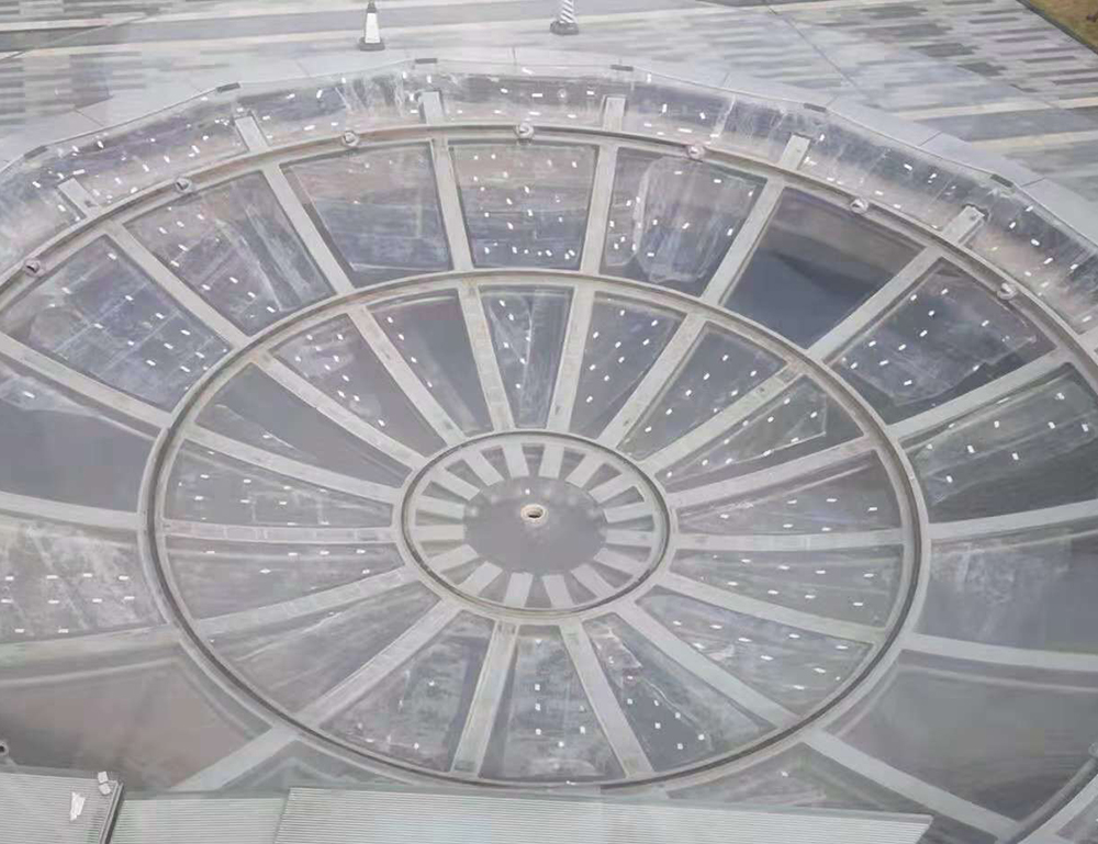 项目概况:项目由4块80厚亚克力结构胶粘接而成。其中底部亚克力为一块直径约2.8米亚克力整体烘弯。第二层第三层第四层分别为5块、6块、8块弧形亚克力现场拼接而成。亚克力拼缝共有19条,其中第二层5条、第三层6条、第四层8条。拼接方式为每层一次注料同时聚合。二层和四层放置于19m拼接棚拼接,三层放置于14m拼接棚拼接。