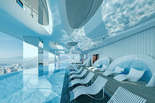 东莞CBD全透明悬空无边际泳池项目中,便成功完成单块重量超16吨、总面积320平方米的板材安装,实现100米高空“云端畅游”的震撼体验。