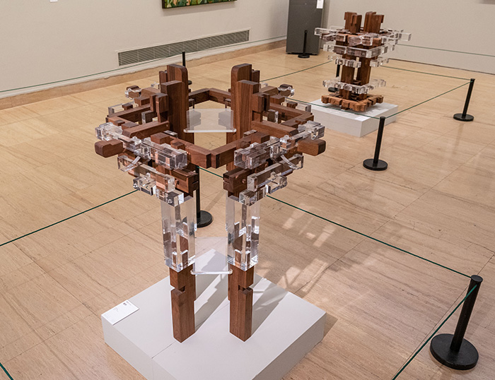 亚克力与实木等材料结合,通过雕刻与拼接呈现榫卯等传统艺术形态,融合现代材质与东方美学。