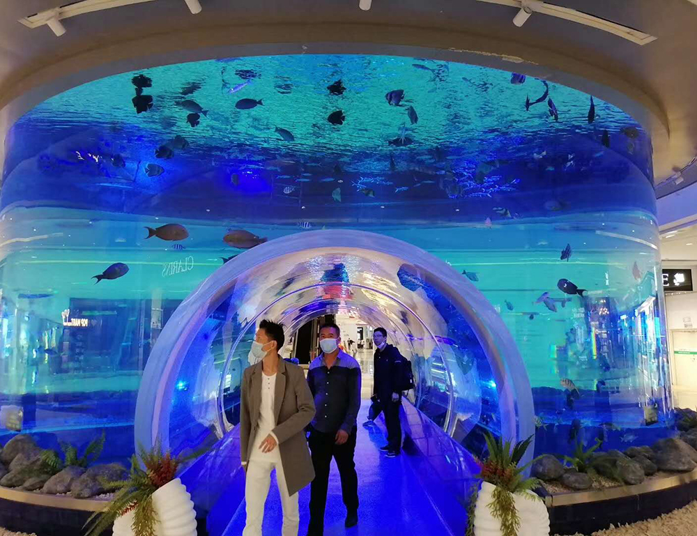 汤臣科技打造的这个亚克力隧道水族缸,直径10米,高度10米,厚度200,隧道厚度130MM