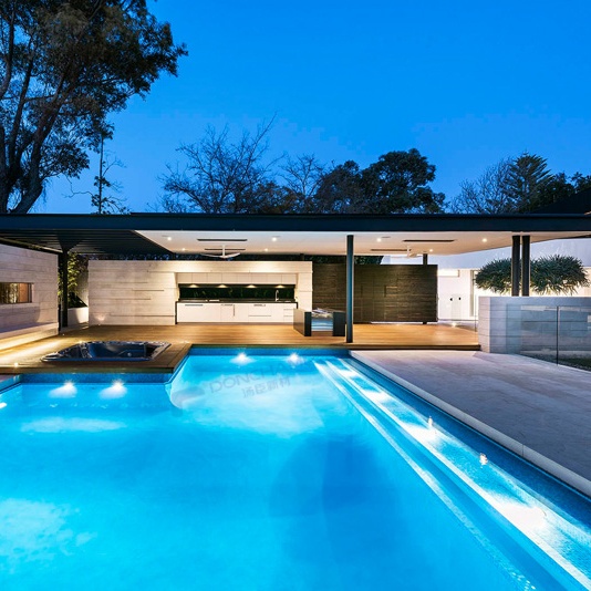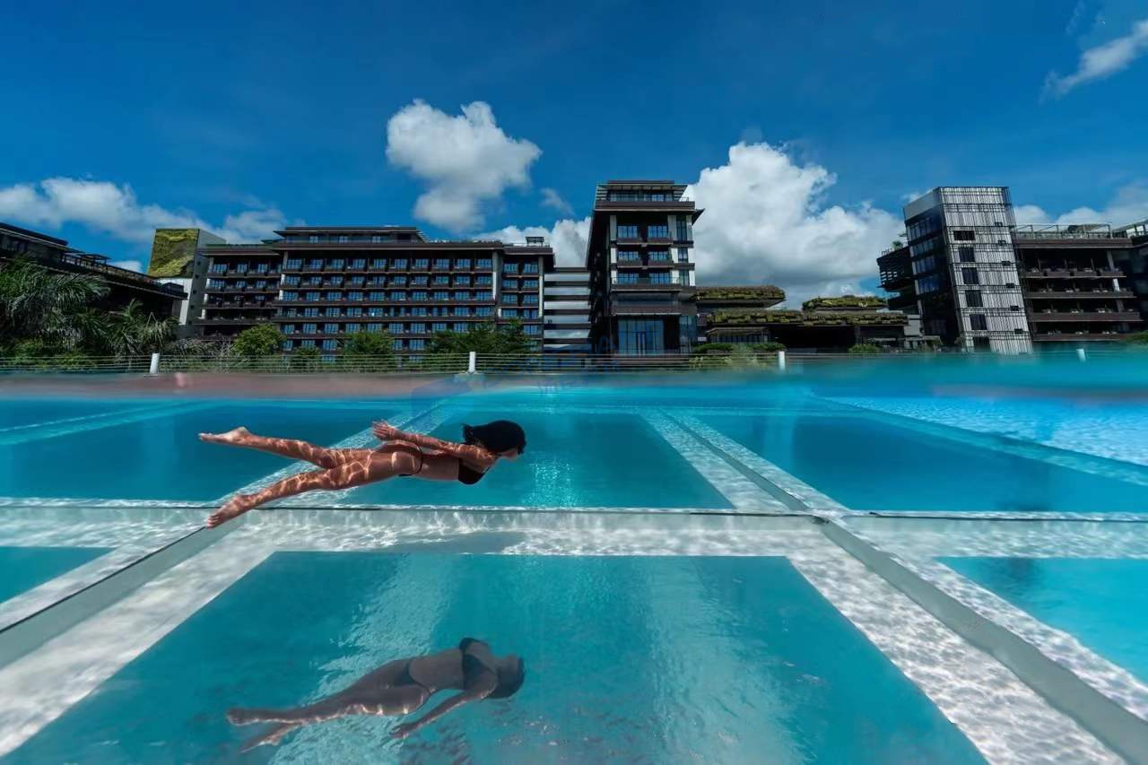 亚克力泳池采用悬挑设计时,池体的一部分(通常是透明侧壁或底板)伸出建筑主体之外,下方无直接支撑。