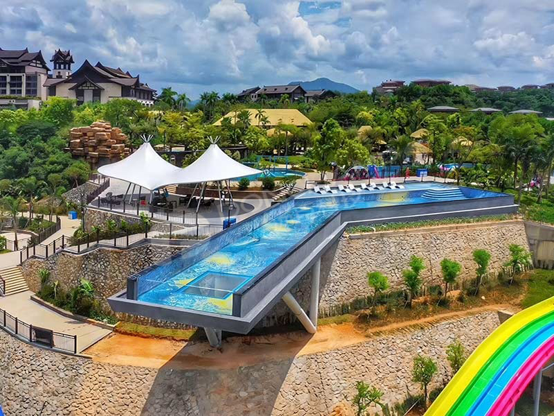 Van Gogh themed ultra long swimming pool, with the panel thickness of 150mm, a cantilevered infinity pool that floats for over 20 meters, and a suspended height of over 20 meters.