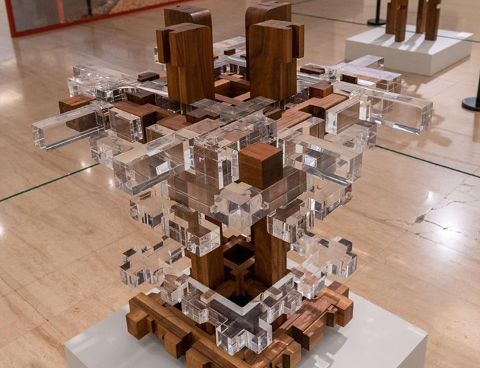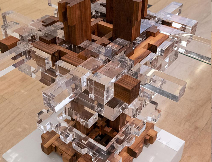 亚克力与实木等材料结合,通过雕刻与拼接呈现榫卯等传统艺术形态,融合现代材质与东方美学。
